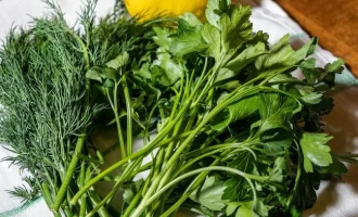 - Daržoves apkepkite, kol taps auksinės spalvos, ir sudėkite smulkintą salierą, česnaką ir lauro lapą. Kai baigsis, įpilkite daugiau aliejaus.